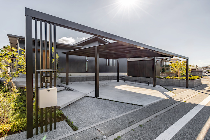 スクエアな建物に合わせてスタイリッシュですっきりとした雰囲気に最も適したものは、「Mシェード」という特徴的なカーポートです。 これは屋根が「トラス」構造になっており、曲線を廃した都会的なデザインが、建物の外観にとても似合います。また、カーポートの柱はアプローチに2本かかるため、柱の位置を決めてアプローチのデザインを構成しました。柱の位置を前後でずらし、柱は花壇に入れてアプローチを歩く際に邪魔にならないようにしました。門扉の上に梁があるので立派なゲートのように見えます。
