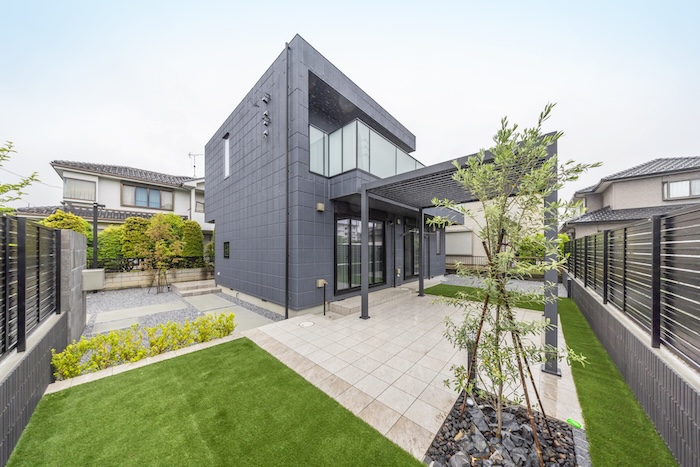 床材にはベージュ系タイルを採用し、ダークトーンの建物にやさしい明るさをプラス。室内から外へと気持ちよくつながる、開放感のあるお庭に仕上がりました。周囲は目隠しフェンスで囲い、プライバシーにも配慮しています。