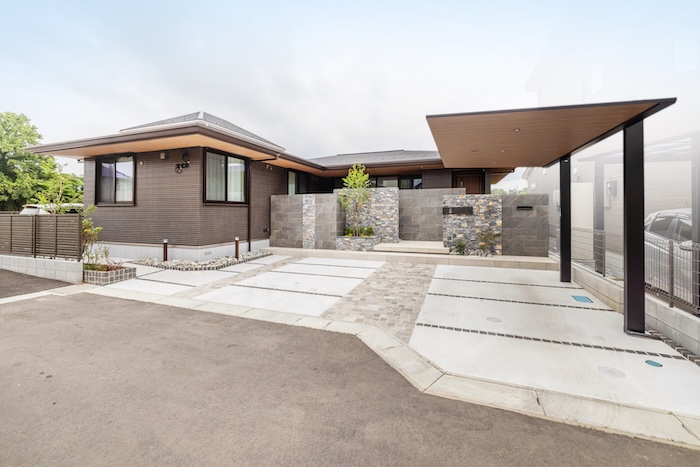 タイルと石貼りで仕上げた門構えが印象的なファサードは、落ち着きと風格を感じさせるセミクローズスタイル。門袖を前後にずらして配置することで、奥行きと重厚感を演出しています。カーポートは建物の軒と同系色の天井材付きを選定し、統一感を持たせました。