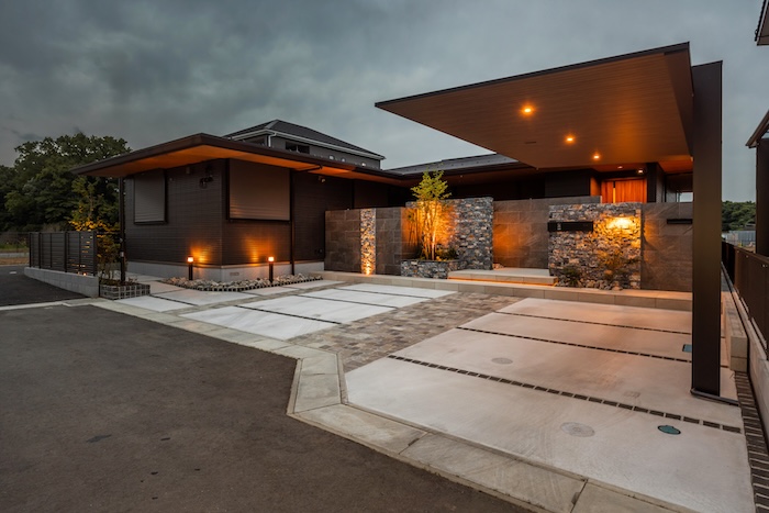 迫力のあるデザインが印象的なカーポートを使用した宮川様邸のエクステリアはお住まいとの一体感があり、圧倒的な存在感を放ちます。また天然素材をふんだんに使用した本物ならではの美しい質感が楽しめるエクステリアです。夜の景観にもこだわり、ライティングを多く取り入れました。昼間だけではなく夜もシックで洗練された表情を楽しめます。高級感溢れるプレミアムなエクステリアが出来上がりました。