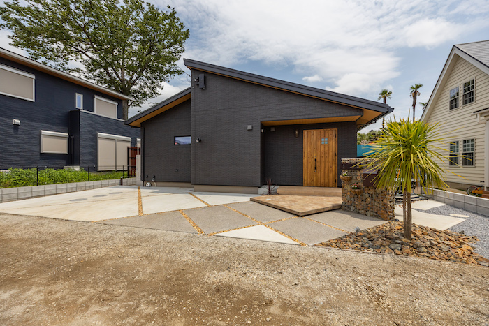 ブラックを基調としたア-バンな印象の建物にブラウン系の温かみのある石材などを配置し特別感のあるエクステリアとなっています。