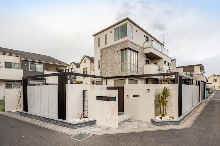 角地の広々とした土地の外周をぐるりと囲いこむ迫力のある設えは、通りがかる人の足を止めるほど見ごたえたっぷりです。