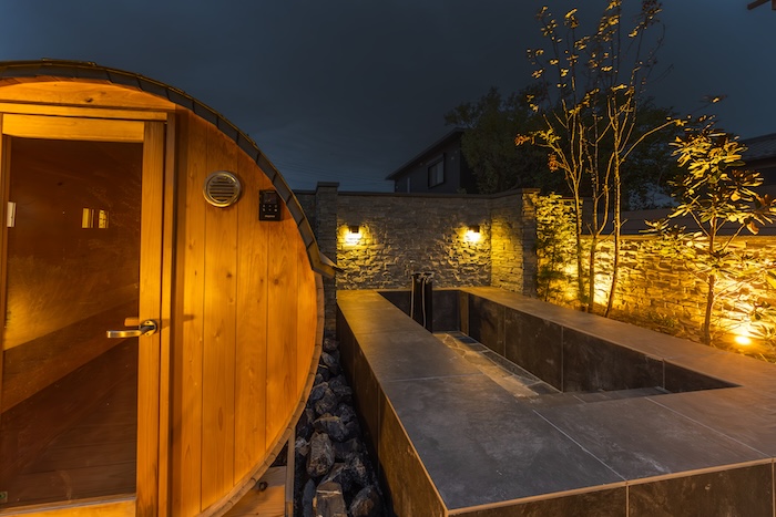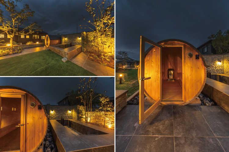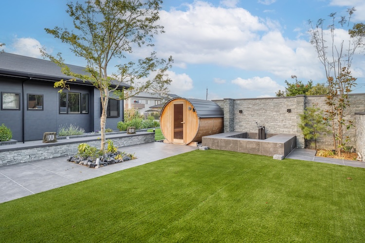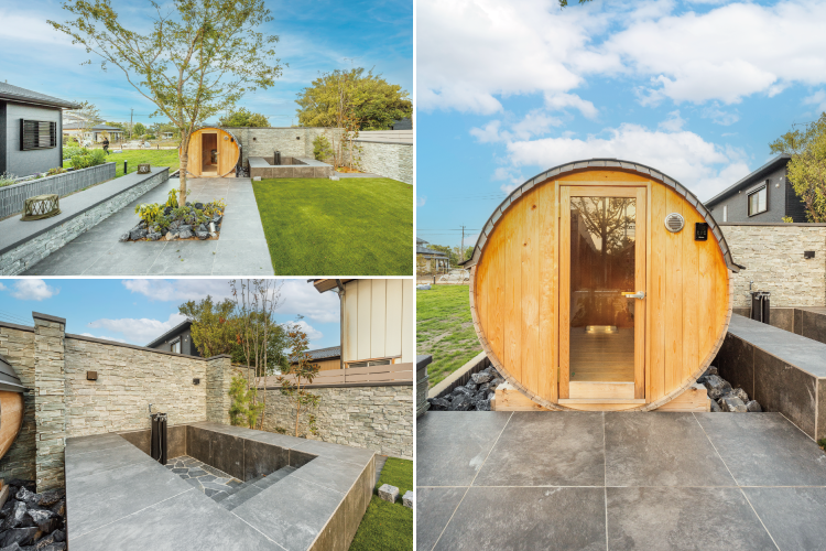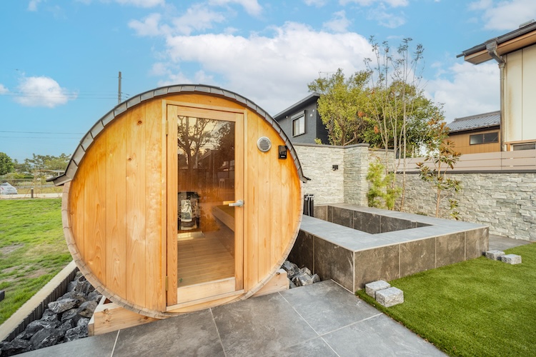 タイル張りのガーデンを奥へ進むと、そこにはコロンとしたフォルムが愛らしいバレルサウナが顔を見せます。