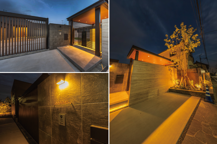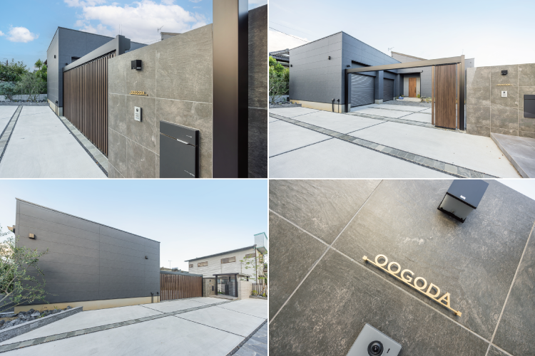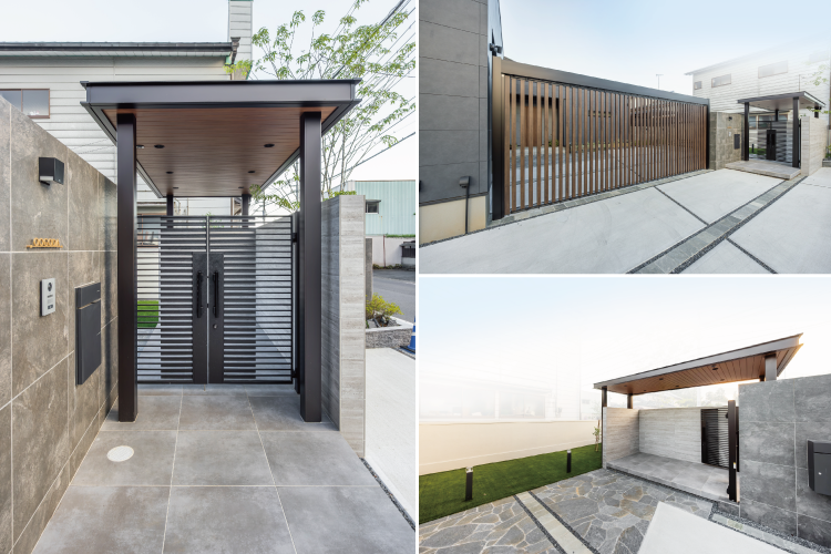 「縦スリットが美しいゲート」や「重厚感たっぷりのタイル貼門袖」といったスクエアな構造物。