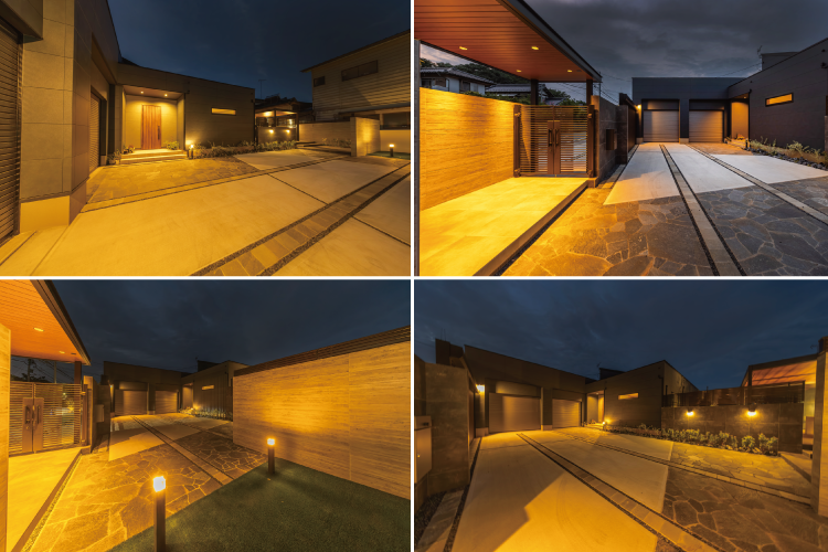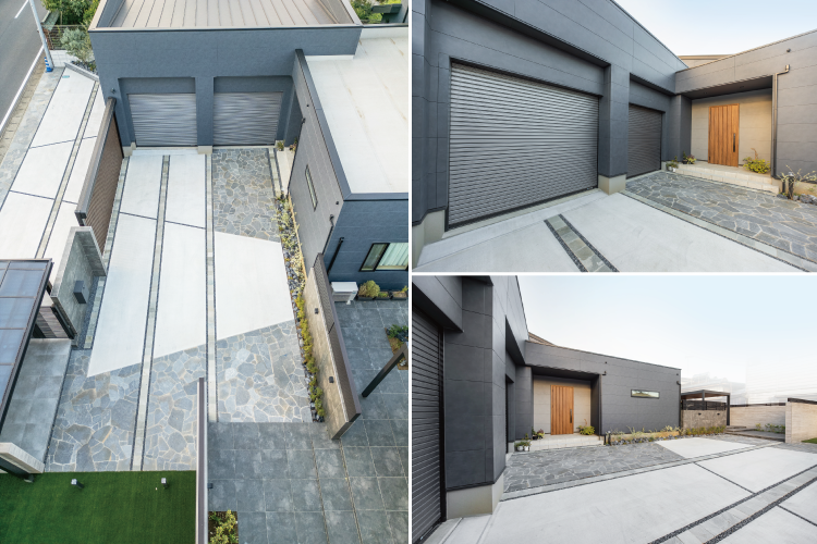 駐車スペースでありながらも、エントランスから玄関やガーデンへと繋ぐアプローチとしての役割も担っています。