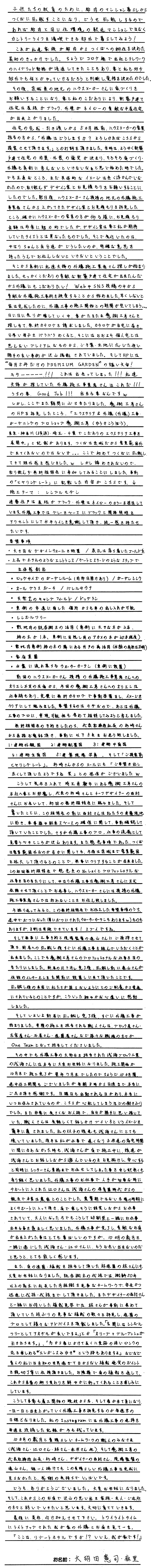 大胡田様の理想のお庭を実現させるお手伝いができたこと、スタッフ一同、大変光栄に思っております。今回のお庭作りを成功に導いたポイントは、具体的なご要望をリスト化していただき、教えていただけたことです。お庭作りは、お客様と外構業者それぞれがアイディアを出し合うことで、初めて満足度の高いものになるのではないでしょうか。