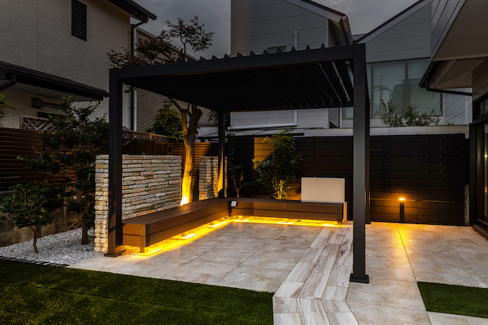タカショーのガーデンアップライトミオは植栽の根元に配置することで、木々の陰影を立体的に浮かび上がらせます。ベンチ下に忍ばせたドットレスLEDバーは、足元にやさしく広がるライン状の光が印象的で、パーゴラまわりがまるでホテルのラウンジのような雰囲気に変わります。