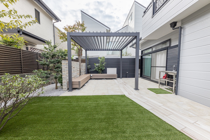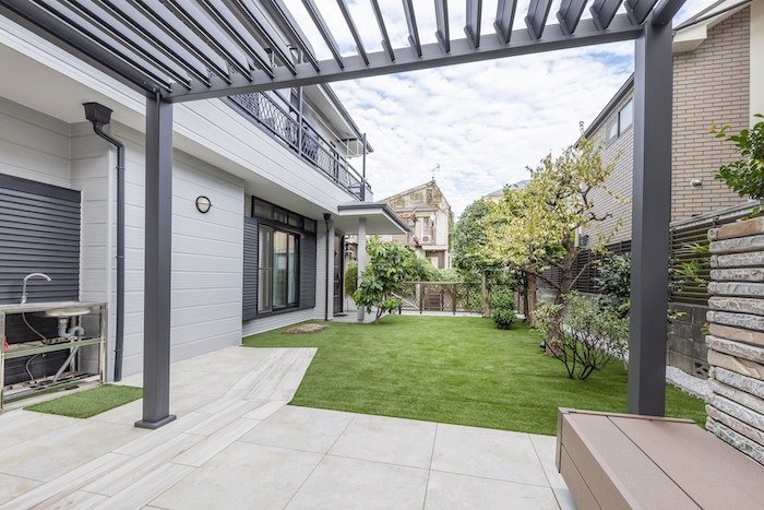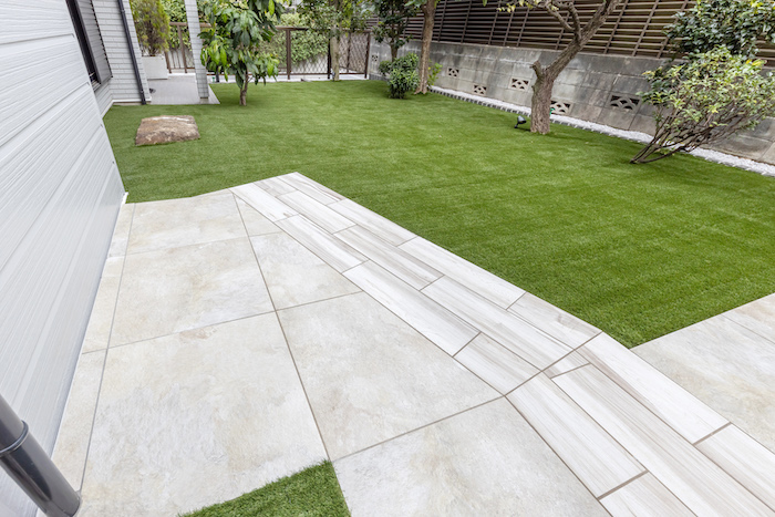 まず、視界を大きく広げてくれるのが人工芝のエリアです。下地には防草シートと砕石をしっかりと敷きこみ、排水マス周りも丁寧に調整。青々とした人工芝は一年中美しい状態を保ち、お子さまが駆け回っても柔らかさが安心感を与えてくれます。建物に沿ってタイルテラスを配置することで、室内からの動線もスムーズになり、家全体の「外と内」のつながりがより自然になっています。