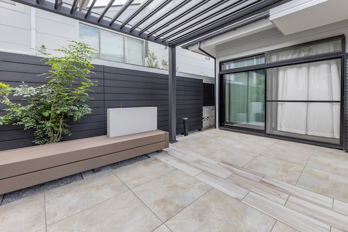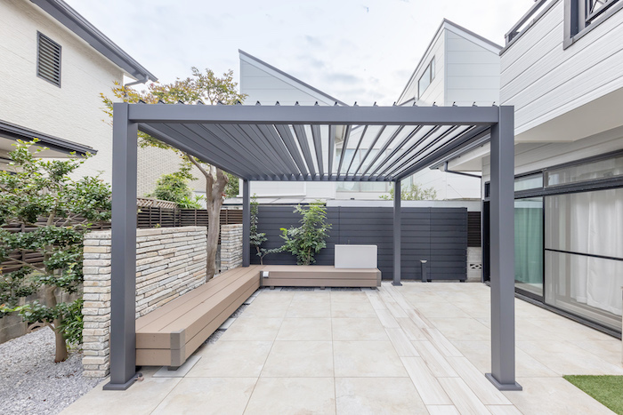 タイルテラスをより贅沢な空間へと引き上げてくれるのが、タカショーのパティオムーヴ。ルーバーを可動させることで、季節や時間帯に合わせて光と風を調整でき、暑さを和らげたり雨の日も安心して過ごせたりと、屋外とは思えない快適さが魅力です。併設したウッドデッキ仕様のL字型ベンチは、家族や友人が気軽に腰かけられ、自然と会話が生まれるやわらかい場所に。