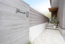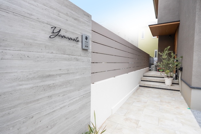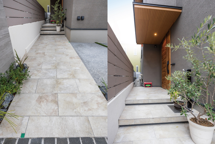 山本様邸では、明るいベージュ系の600×300角タイル(イオニア アイコットリョーワ)を採用し、柔らかく上品な印象に仕上げました。アプローチに設けたステップは蹴込階段とし、バーライト(タカショー ドットレスLED)を埋め込むことで、夜間も安全かつ視認性の高いデザインに。デザインウォールには杉板模様を施した〈セラウォールRC(タカショー)〉を用い、コンクリートでありながら温かみを感じる表情をプラス。表札には丸三タカギの〈ワンダーワード〉を採用しています。毎日の行き来が楽しくなる洗練されたアプローチ空間が完成しました。