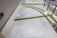 駐車スペースは、外構全体の印象を決定づける大切なスペース。山本様邸では、洗い出し仕上げの土間コンクリートに人工芝の曲線ラインを組み合わせました。街角でもひときわ目を引くデザインで、通りを行き交う人の視線を集めます。 人工芝には防草シートと砕石の下地処理を施しており、雑草対策も万全。さらに、境界部分には黒のピンコロ石〈ブイグラニット〉をアクセントとして用いて、空間全体を引き締めます。