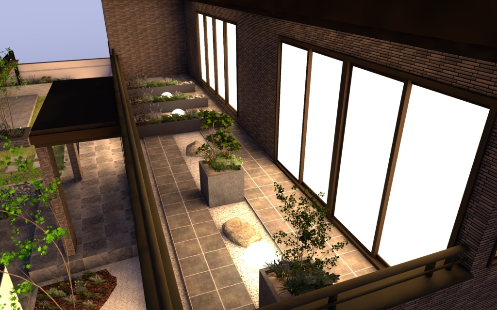 ベンチなどを配してゆったりと寛げるプライベ-トガ…
