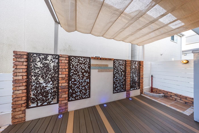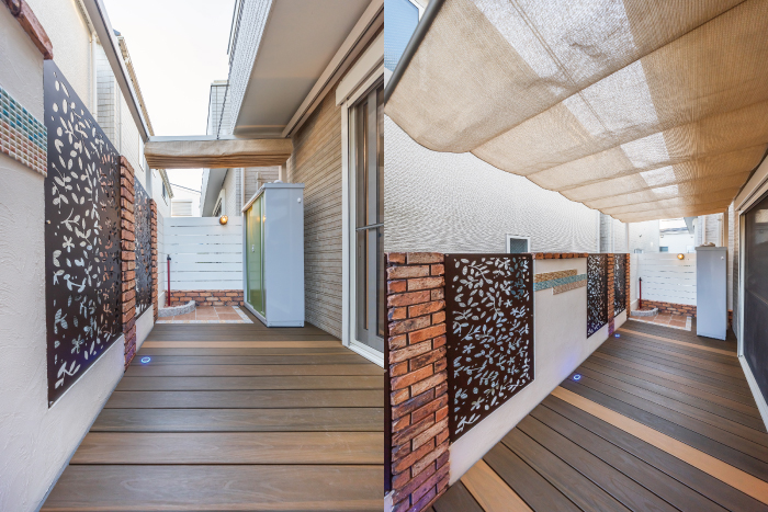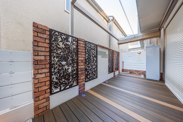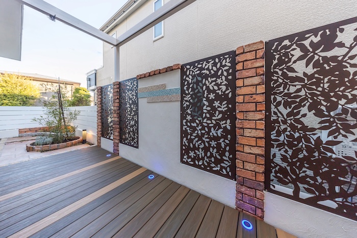 境界には、視線対策として機能性と意匠性を兼ね備えたデザインウォールを設置しました。