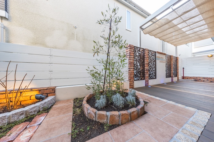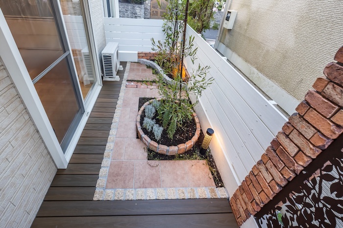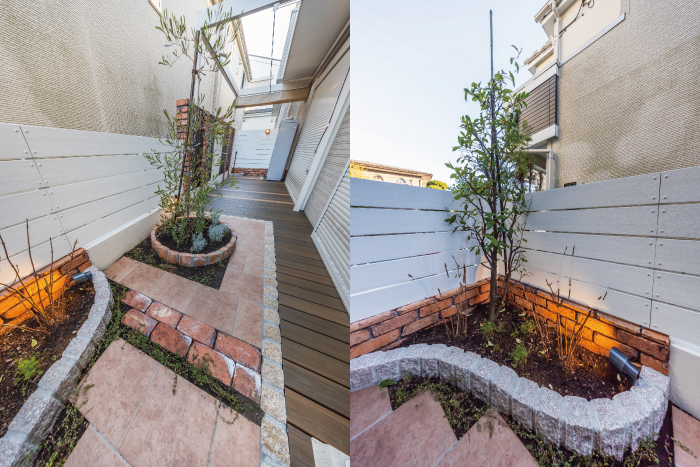 ウッドデッキと合わせて計画したのが、タイルとレンガを組み合わせたガーデンスペースです。