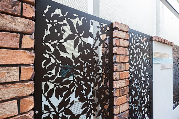 さらに 繊細でエレガントなデザインが特徴の タカショー「デザインパネルⅡ(フローラ/アルゴ)」を組み込むことで 視線をやさしく遮りながら 圧迫感のない 軽やかなエクステリアに仕上げました。