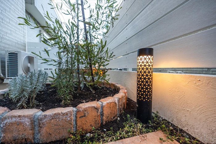 庭の中心にはシンボルツリーを据え、足元には低木やハーブ類を配置。照明はタカショーのガーデンライトを中心に構成。アップライト、リングフラットライト、トーチパススタンドを適所に配置し、昼とは異なる表情を夜の庭に与えています。