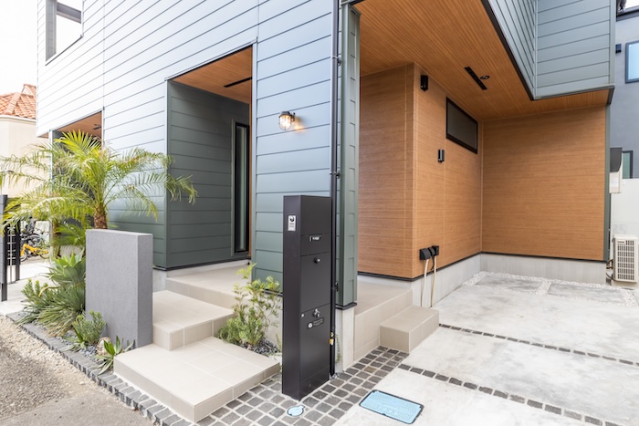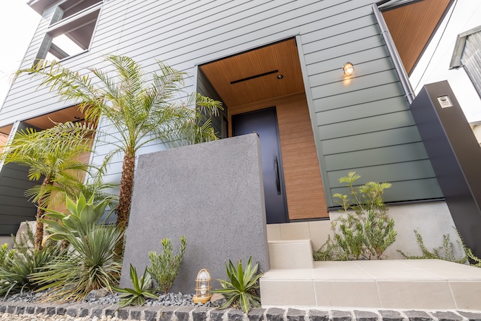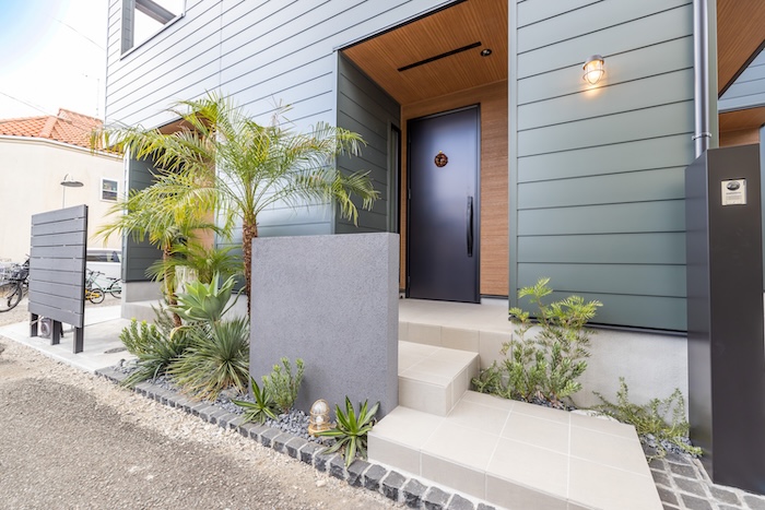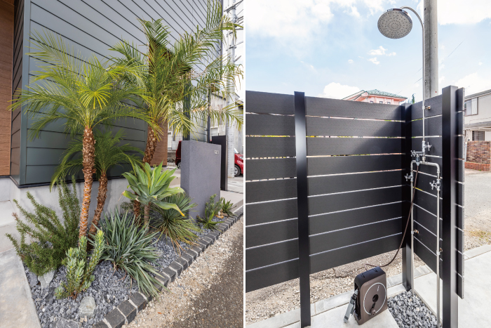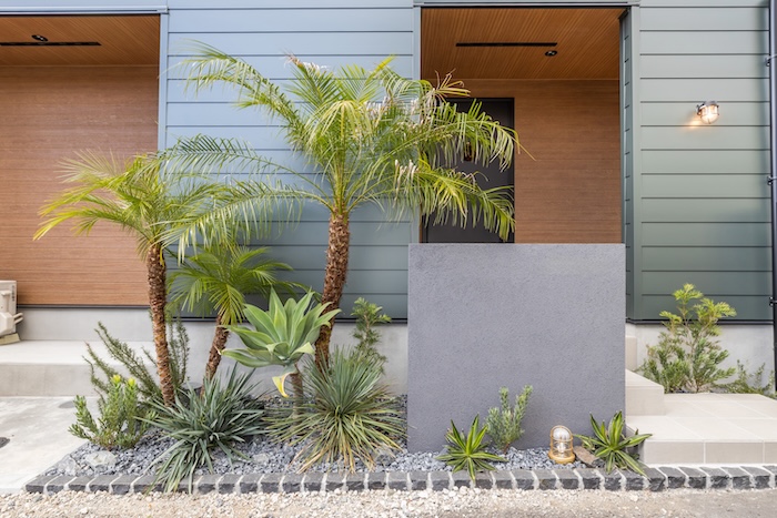 その象徴となるのが、門周りのデザインです。メインの門柱には、スタイリッシュなデザインが特徴のLIXIL「機能門柱FT」を採用しました。一方で、その足元にはゴロタ石や化粧砂利を配したドライガーデンを設置。アメリカの西海岸を彷彿とさせるドライな質感と、ヤシやグラス系の力強い緑のコントラストが、訪れる人の目を楽しませてくれます。