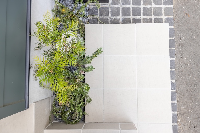 落ち着いたグレーに仕上げたデザインウォールは玄関へのアプローチをクランクさせるための土留めの役割ですが、建物とエクステリアを繋げ、植栽の緑を引き立たせるための「キャンパス」としての役割も担っています。福元様からは「想像していた以上に、家が格好良く見えるようになった」と嬉しいお言葉をいただきました。