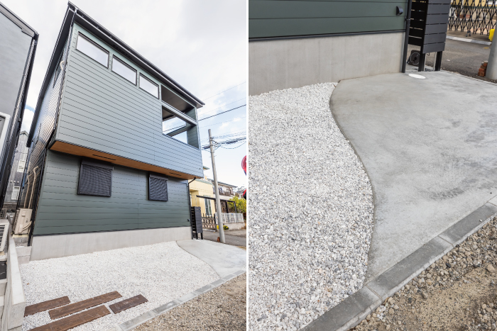 また、生活動線としての使いやすさも徹底的に追求しました。駐車スペースから玄関へと続くエリアには、「土間コンクリート舗装」をベースに、ブラックのピンコロ石の目地でアクセントを加えています。これにより、コンクリート面のひび割れを防止すると同時に、視覚的な広がりが感じられます。さらに、お庭の隅々まで雑草対策として「防草シート」を敷き込み、その上に「6号砕石」や「石灰砂利」を厚く敷き詰めることで、「手入れの負担を減らしたい」という福元様のご要望にしっかりとお応えしています。