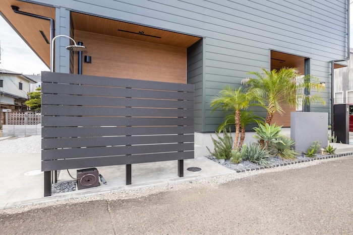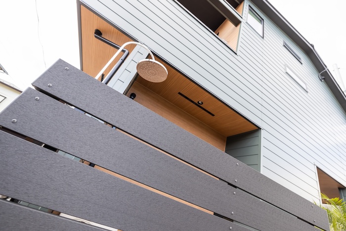 福元様邸のプランニングにおいて、非常に重要な要素となったのが、屋外でのアクティビティを支える機能的な空間づくりです。特にお施主様のこだわりが光るのが、サーフィンなどの趣味を快適に楽しむためのシャワーコーナーの設置でした。今回セレクトしたのは、機能美あふれる「サーフシャワーM」です。シャワー周辺は、耐久性の高いエコモックフェンスを設置し、目隠しと水はねに配慮しました。