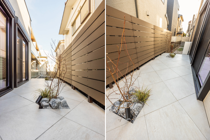 お庭のコンセプトは、敷地を最大限に使い切ること。神田様邸では、あえて土の部分を残さず、隣地境界まで贅沢に全面タイル仕上げを施しました。室内からのフロアレベルを合わせ、リビングからそのまま出られる高さに設計したことで、室内の空間が外まで広がったような開放感を味わえます。