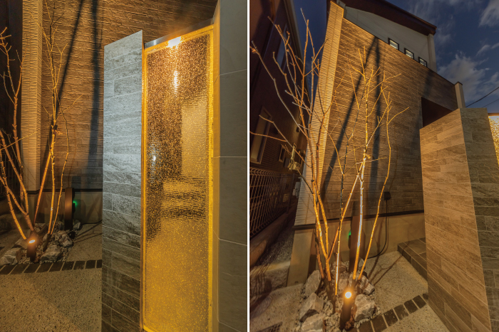 また、門袖(もんそで)には、神田様のご希望であったガラス柱「ロッドクリア(EXALIVE)」を組み込みました。マットなタイル貼りの門袖に、透明感あふれるガラスの質感が加わることで、昼は太陽の光を優しく透過させ、夜はライティングを受けて宝石のように煌めきます。