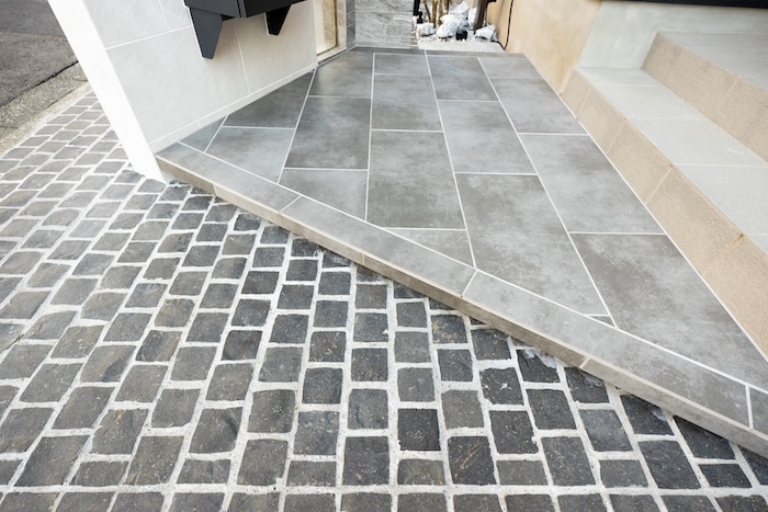 ここで採用したのは、ハイグレードな600角の大判タイルです。ポイントは、タイルの向きを建物に対して「斜め貼り」にしたこと。視線の流れが対角線上に生まれるため、空間の奥行きがより一層強調される効果があります。