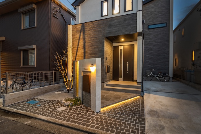 神田様邸のファサードを計画する際、最も大切にしたのは「ゆとり」の演出です。通常、玄関へ向かうアプローチは必要最小限のサイズに収めがちですが、今回は限られたエリアの中で、あえてアプローチをゆったりと大きく広げるという贅沢な選択をしました。