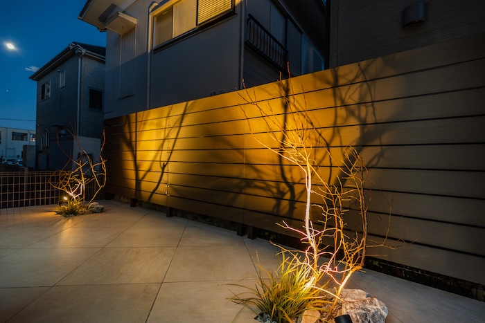夜になれば、植栽を照らすスポットライトの光がフェンスの板面に柔らかく反射し、昼間とは異なる幻想的な表情を見せてくれます。