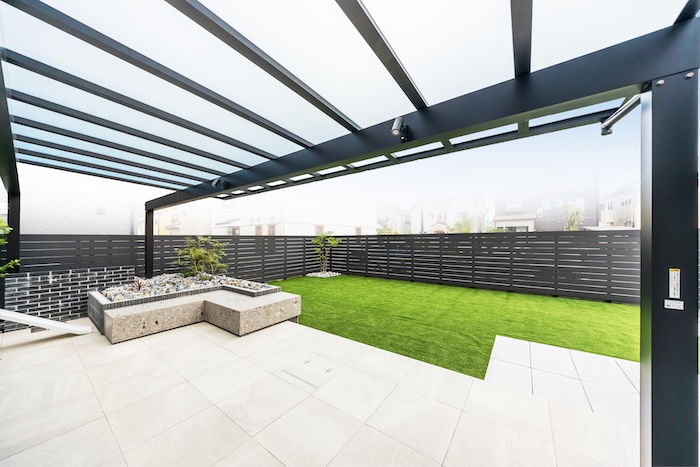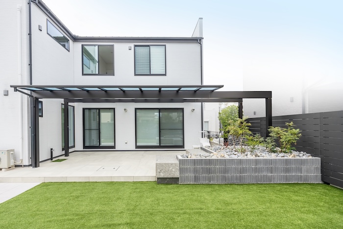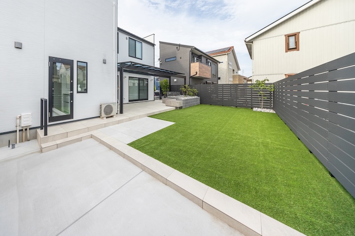ガーデンはタイルデッキと人工芝で、雑草知らずのメンテナンスフリーな設えに。