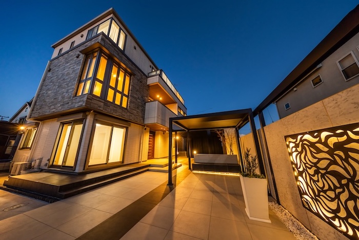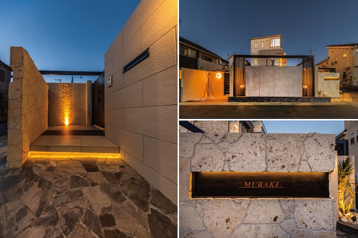 村木様邸のエクステリアはファサード、アプローチ、ガーデンそれぞれに夜も見どころ満載です。