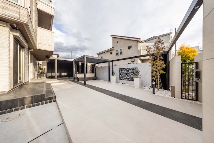 アプローチとテラスを一体的に計画したところも見どころの一つ。