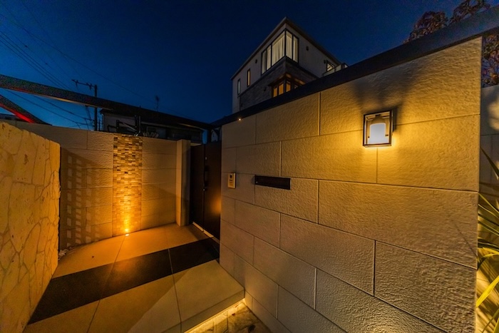 植栽を幻想的に照らすアッパーライトや壁面のウォールライト、門袖のニッチをさり気なく照らす間接照明。