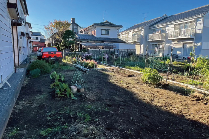 また、玄関から駐車スペース、庭、家庭菜園、物置へと続く動線も整理。