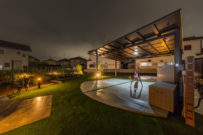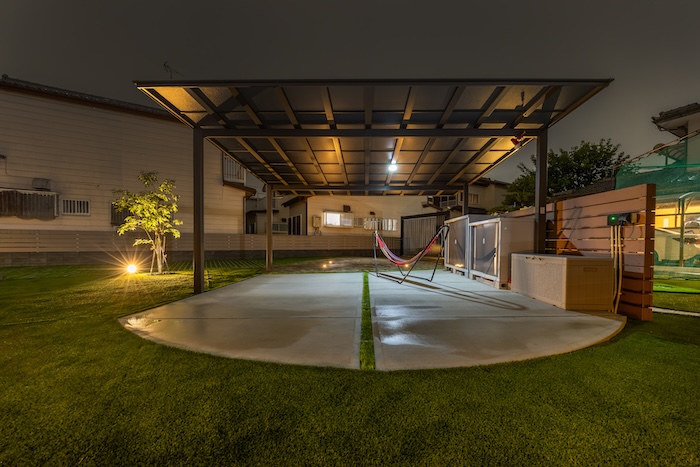 車が停まっていない時間帯には、バーベキューやご家族の団らんの場としても使える、多目的なスペースです。