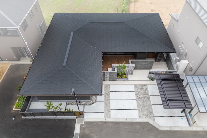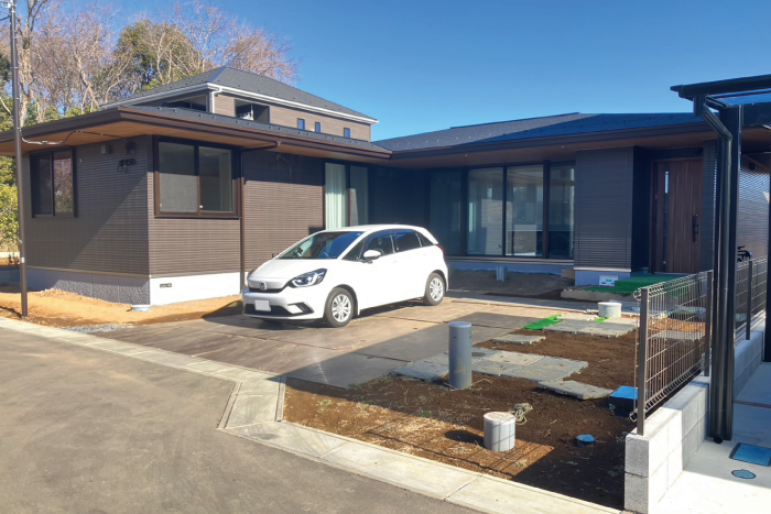 軒の広がりが印象的な平屋のお住まい。その魅力を最大限に引き立てるため、外構全体は「建物に似合う、かっこよさ」を軸にデザインしました。