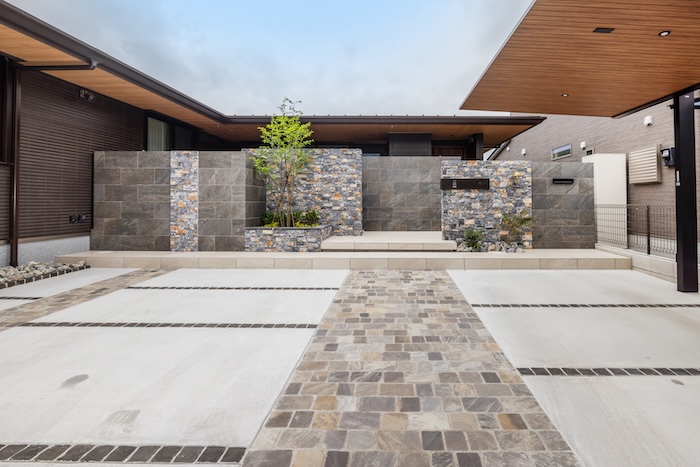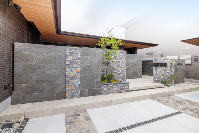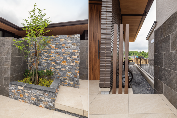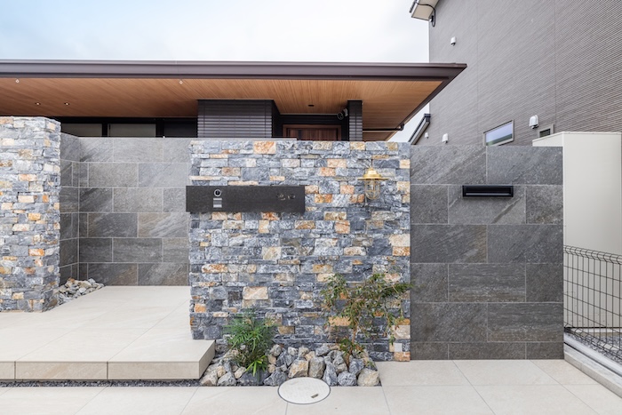 道路に面するファサードは、タイルと自然石を組み合わせた重厚感のある構成としながらも、素材の色味や貼り分けによって、やわらかさを感じられる表情に。建物と外構が自然につながるよう、全体のバランスを丁寧に整えています。