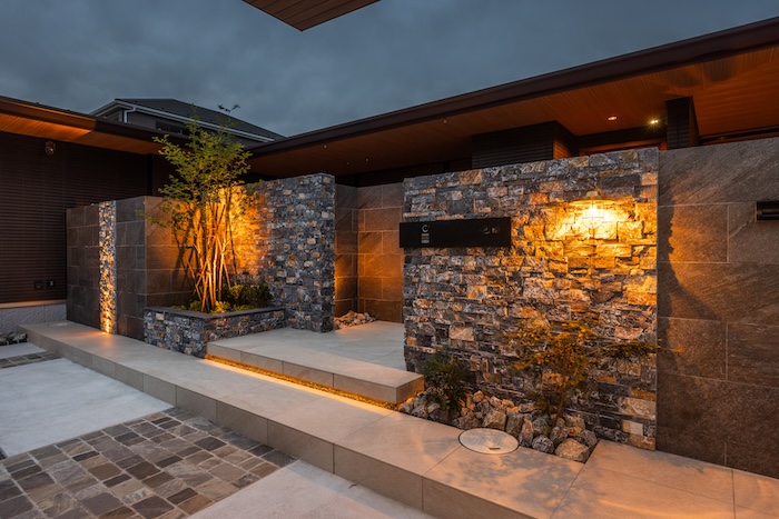 土間コンクリートをベースに、自然石敷きのラインが玄関へとやさしく導く構成。階段はフロート階段とし、夜間には間接照明が足元を照らすことで、安全性にも配慮しています。
