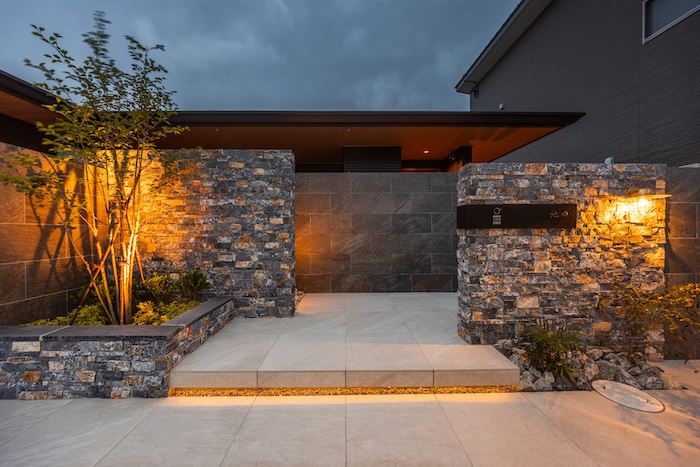 仕上げにはタイルと自然石を使い分け、素材の表情に変化を持たせました。色味は全体を通して落ち着いたトーンでまとめ、建物や周囲の景観と自然に調和するよう配慮。昼は素材の質感が穏やかに映え、夜は照明によって陰影が浮かび上がり、時間帯ごとに異なる表情を楽しめます。
