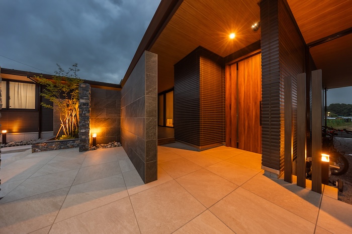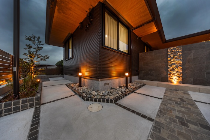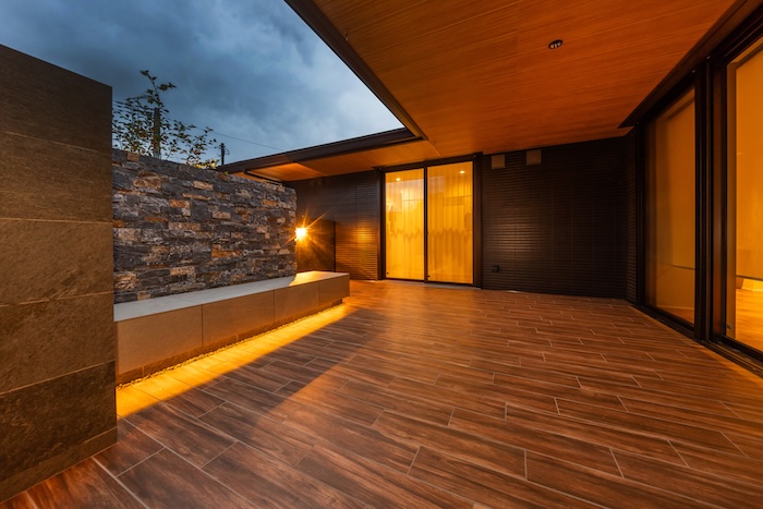 完全に囲われたプライベートガーデンのため、周囲の視線を気にすることなく、心から落ち着ける時間を過ごせるのも魅力のひとつ。夜には壁面や足元を照らす間接照明が、素材の質感や植栽のシルエットをやさしく引き立てます。