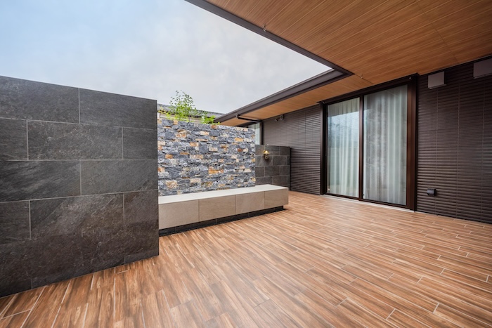 プライバシー確保のため、ファサードウォールはあえて高さを持たせていますが、圧迫感を抑えるため壁を前後にずらして配置。奥行きを感じさせ、空間がのびやかに広がるよう工夫しました。