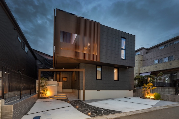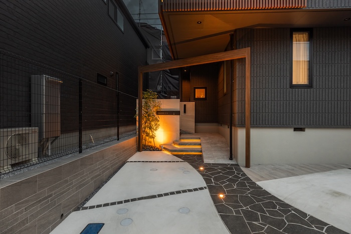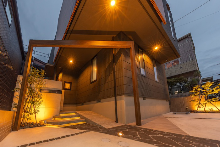 夜はライトアップにより、まるで高級ホテルのエントランスを思わせるかの様なオシャレな表情を見せる井上様邸。