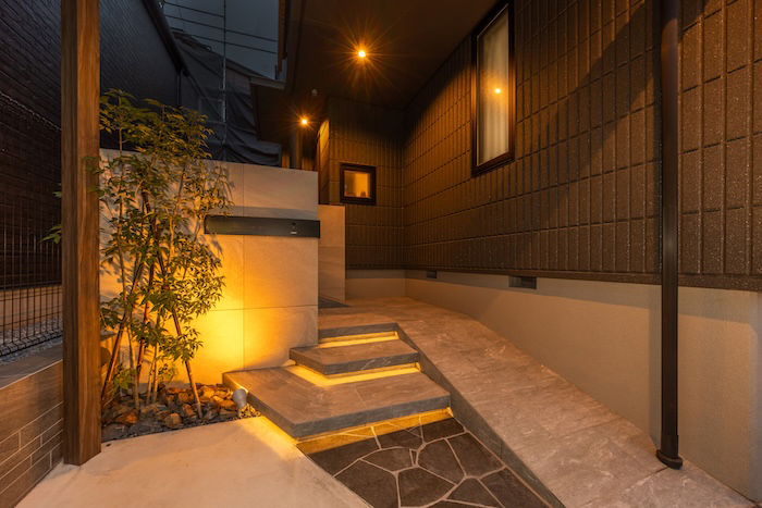 石張りに沿う様にテンポよく配された埋め込みライトは、玄関へと続くみちしるべの様。