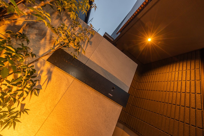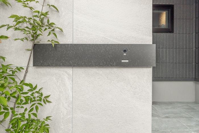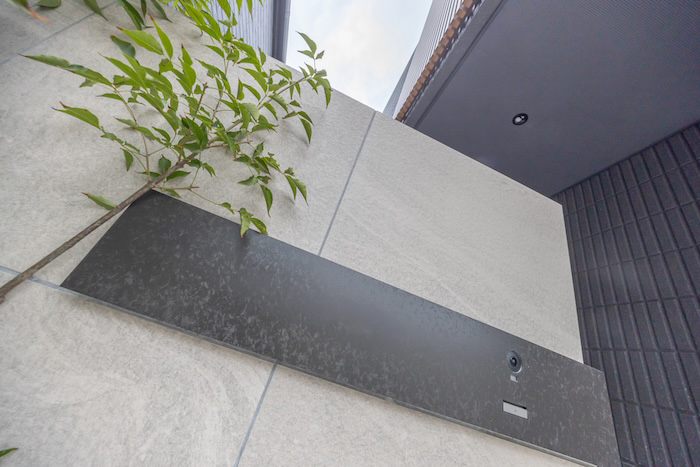 表札はタイルのサイズ感に合わせ、大ぶりのカバープラスロング(オンリーワン)を選び、バランスの良い構成となっています。