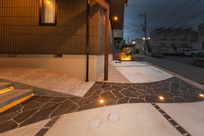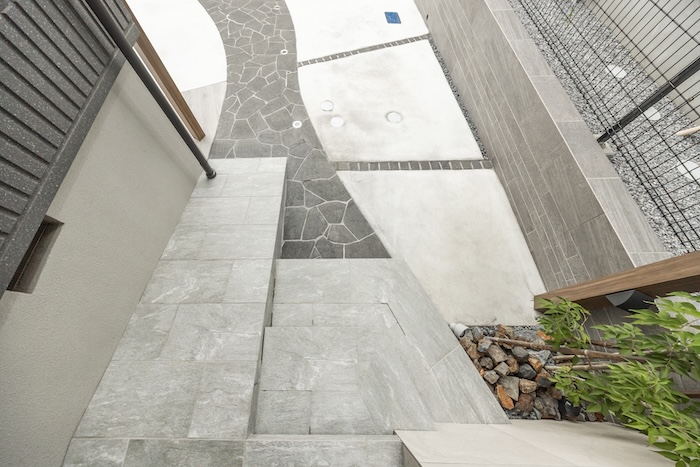 アプローチ部分は緩やかな曲線を描く乱形石張りに。