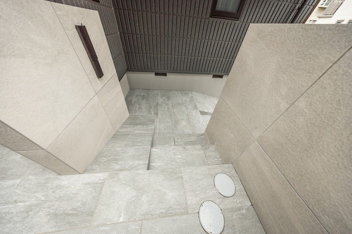 落ち着いたカラーで、階段とスロープに訪れる人を自然と導いていくような特別感のある設えです。